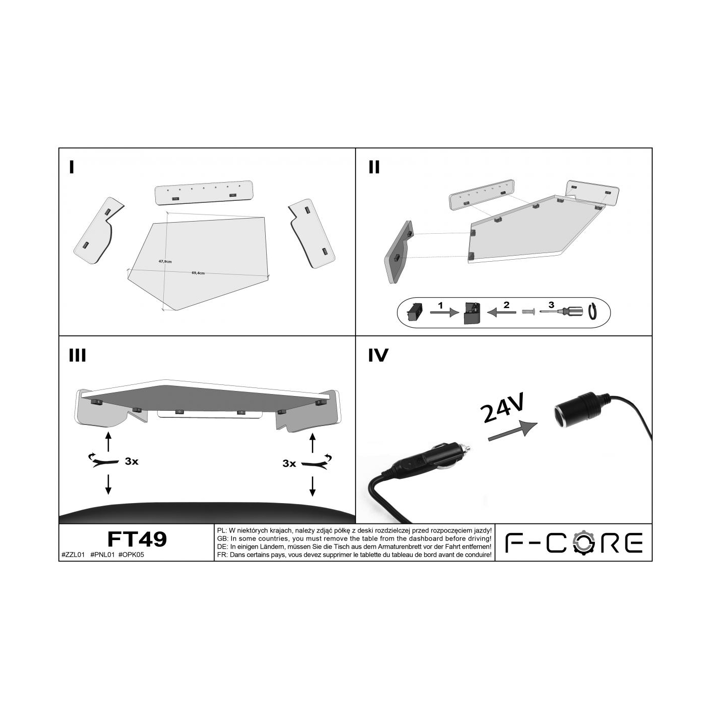 Tudo o que o condutor precisa para instalar a mesa está na caixa: instruções de instalação, velcros, parafusos e uma chave Allen.