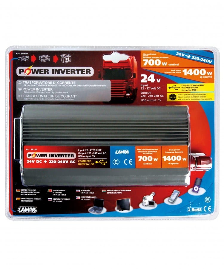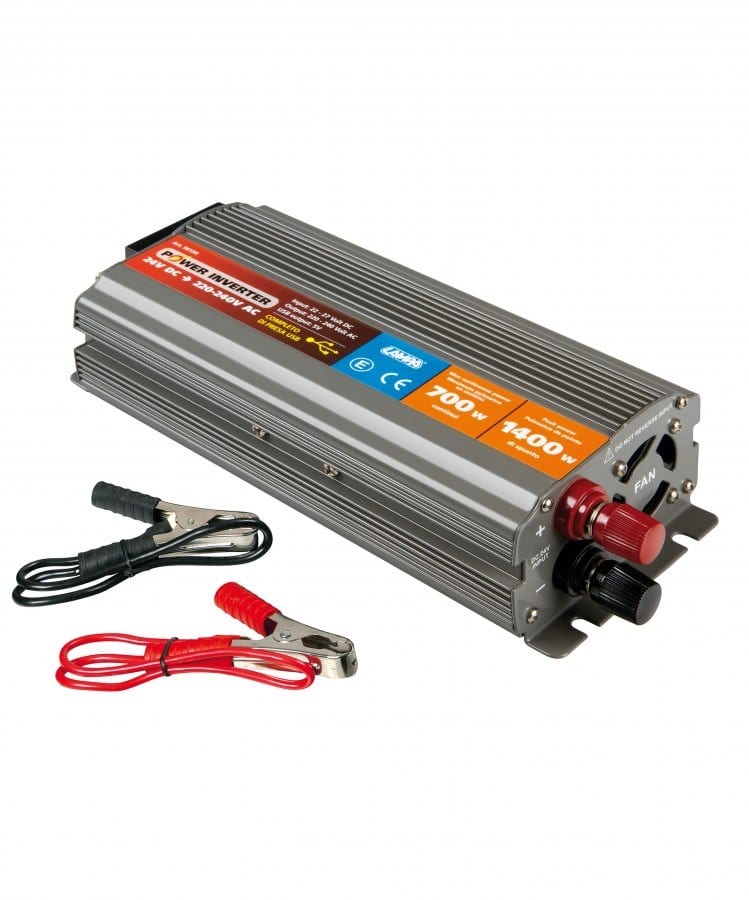 Transformador de corrente de 24V DC para 220V AC. Estes transformadores permite que aparelhos 220V sejam ligados a fontes de alimentação de 24V. Pode ser aplicados em camiões, carros, caravanas e barcos.